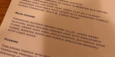 Having previously checked out the menu, I felt some uncertainty as we arrived. The starter was described as (deep breath) “A taste of York. Twice baked olde York cheese soufflé, donut of slow braised ox cheek in Minster ale served with horseradish cream, ‘Green eggs and York ham’ great play on a classic, goodness vegetable root crisps with homemade hummus, cured Yorkshire trout and lemon thyme”. Surely we weren’t going to attempt to eat all of those elements? Was I meant to have previously selected a dish? Deciding to ignore my concerns and feign ignorance should it become apparent I’d somehow cocked up my order, we relaxed into the evening, helped no end by the presence of local food scene heroes including Gilly Robinson from Malton Cookery School and master chocolatier Andrew Thwaite.