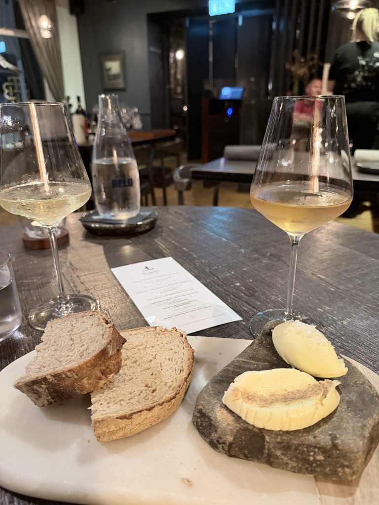 With my minimal baggage deposited safely in the room, I took myself for a stroll around town, settling in a local pub with a book for half an hour before returning to Tsuchi at The Black Bull to take my seat for dinner in a dining room that was minimalist without tipping into austerity. A number of dishes on the menu piqued my curiosity and offered elements rarely seen in this kind of setting. First up though the usual trio of canapés, this time featuring a cheese fritter showcasing Mrs Kirkhams, a lamb tartare tartlet and a grilled Lindisfarne oyster. The first two of these were exactly the sort of preamble one would want before embarking on the rest of the menu, but I was struck in particular by the sweetly dressed oyster which had benefitted hugely from exposure to heat. Oysters are very much a take or leave item for me but this was a very pleasant surprise. Bread and butter up next presented the the usual test of restraint as I tried not to fill up while slathering it with the delightful cultured butter.