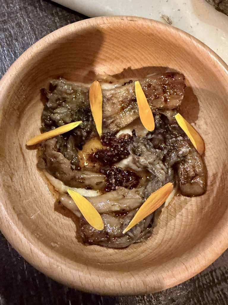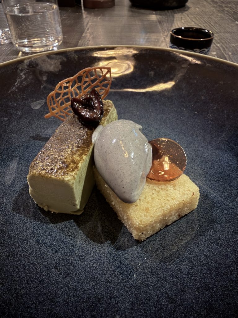 Next up was another new one to me in the form of teal which had been cured. This small duck had a deep and slightly gamey richness that made great friends with the Jerusalem artichoke accompanying it and a generous splodge of caviar for seasoning; a great introduction to this meat for me. More meat came next in the form of a perfectly presented piece of beef served with “Tokyo Turnip” and Nori seasoning. When I posted this one to Instagram, someone commented on what a perfectly cooked piece of beef this was and I can’t agree more, with rich braised beef on the side too. The dainty turnip was just as memorable with a lovely delicate flavour to show off and accent the beef.