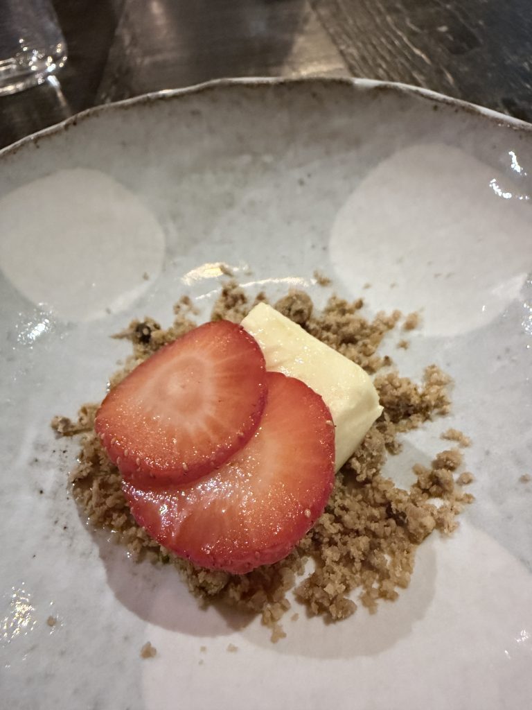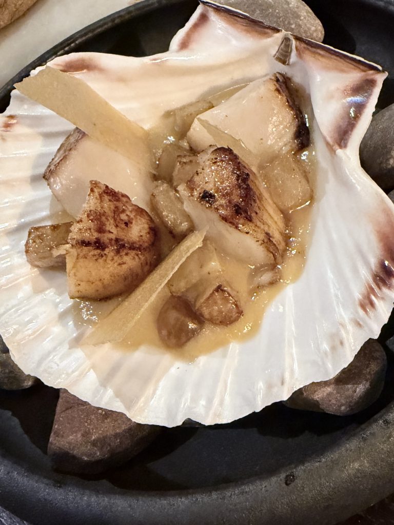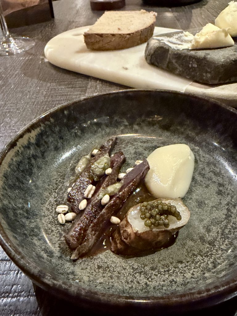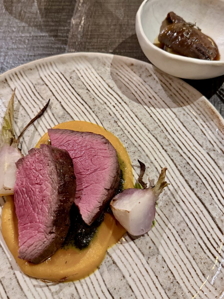 The first “proper” course used mushroom as a carrier for kombucha and was livened up with a few petals to break up the pallette. On eating there was an intelligently measured spice that earned fulsome praise from another couple who were dining that night, a sentiment I would echo. A distinctive and strong start that was followed by an optional scallop dish which I couldn’t resist when I noted it was served with gooseberry and kohlrabi. This was another unique pairing that I hadn’t come across before and could have ended up earning such euphemistic praise as being “intriguing” but thankfully was just plain tasty and perfectly executed. The gentle earthiness of the kohlrabi offset the indulgent sweetness of the scallop neatly.